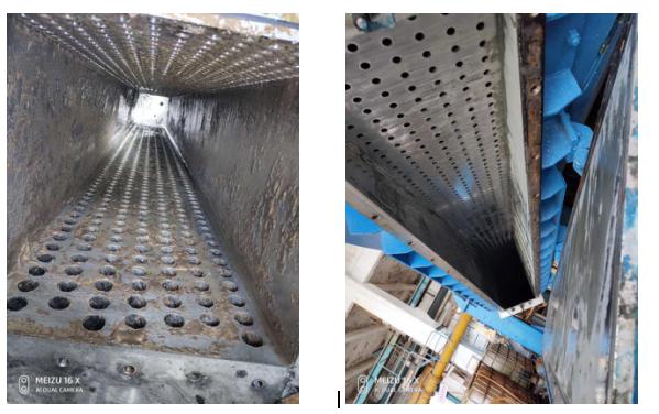 流漿箱進(jìn)漿方錐總管和緩沖室、飄片室內(nèi)部漿流面以及唇口區(qū)(下唇板漿流面、側(cè)墻板、上唇板梁漿流面)結(jié)垢嚴(yán)重,內(nèi)部的清潔度和表面的光潔度對于造紙生產(chǎn)非常重要。結(jié)垢如下圖所示: