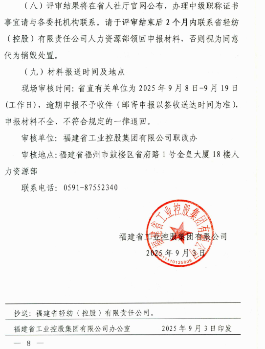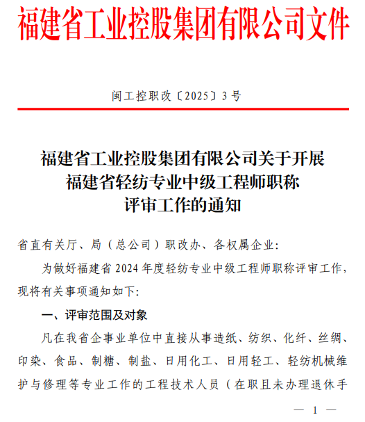 福建省工業(yè)控股集團(tuán)有限公司關(guān)于開展 福建省輕紡專業(yè)中級(jí)工程師職稱 評(píng)審工作的通知
