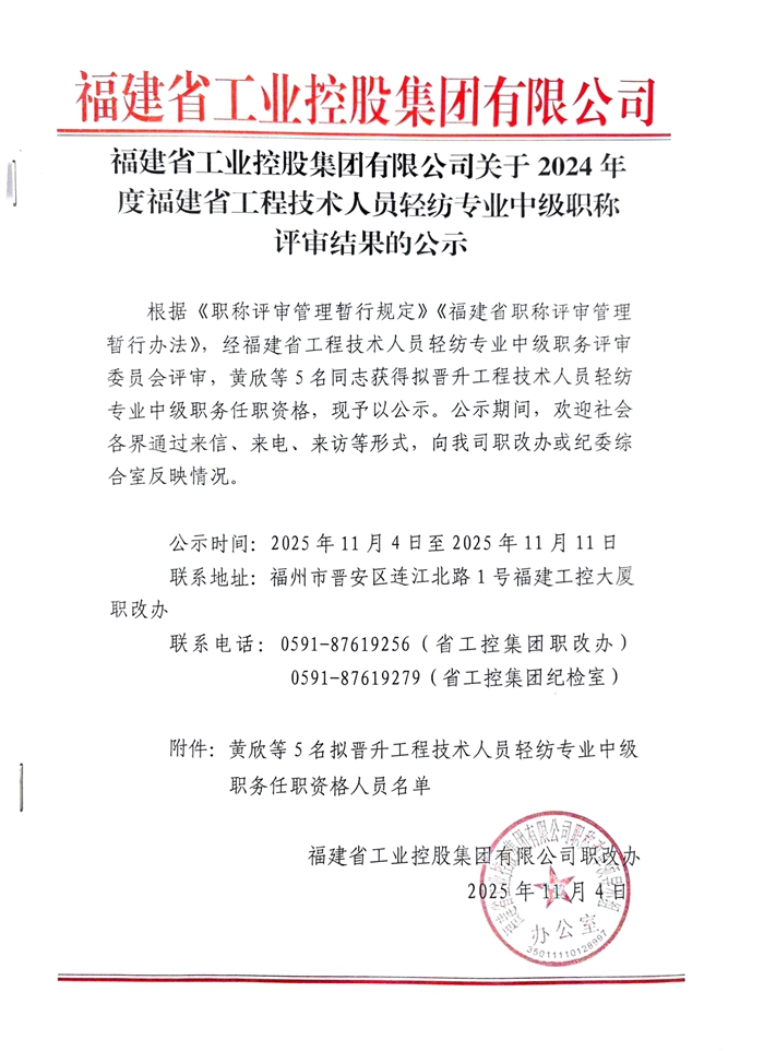 福建省工業(yè)控股集團有限公司關(guān)于2024年度福建省工程技術(shù)人員輕紡專業(yè)中級職稱評審結(jié)果的公示.pdf